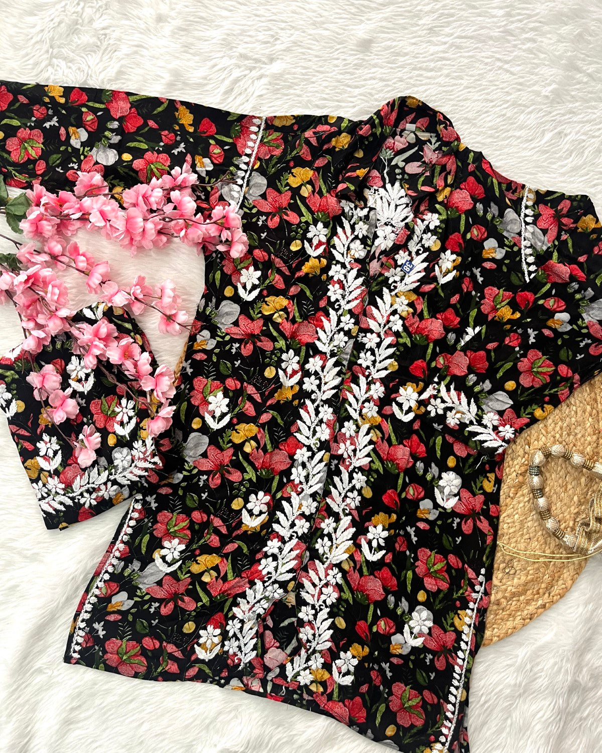 Raha gulab design Chikankari Handwork jacquard cotton long straight kurtis